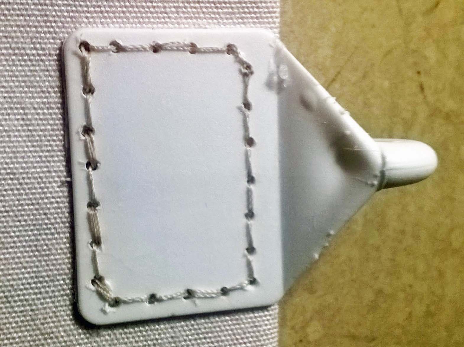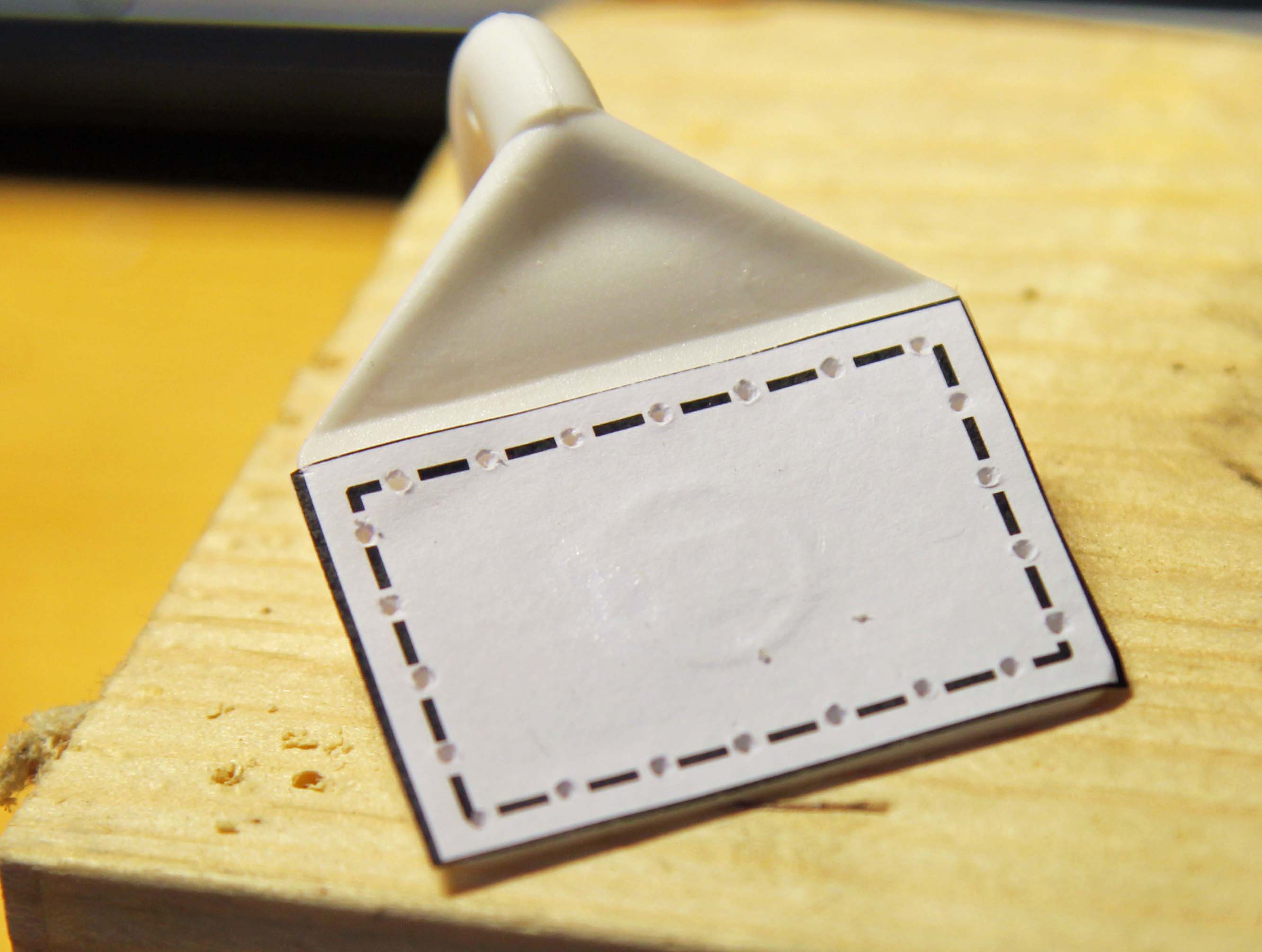 Tein kutakin kiinnikettä varten paperisen leikkaa-liimaa -sabloonan, minkä kiinnitin tavallisella puikkoliimalla. Liimaus kesti sopivasti sen aikaa, että pystyin painamaan naskalilla pienet jäljet reikien porausta varten. Poraus oli helppoa mutta puuduttavaa puuhaa. Olisi pitänyt tehdä pariton määrä reikiä, jotta ompeleminen olisi ollut helpompaa.