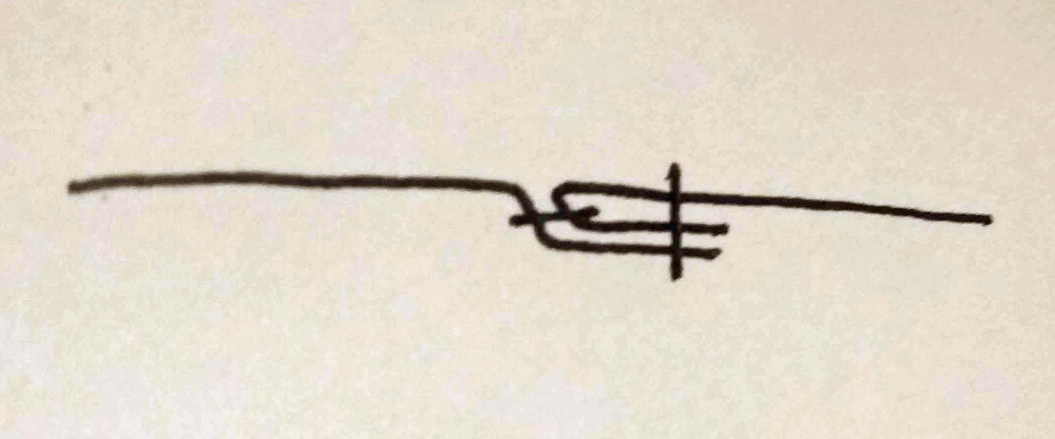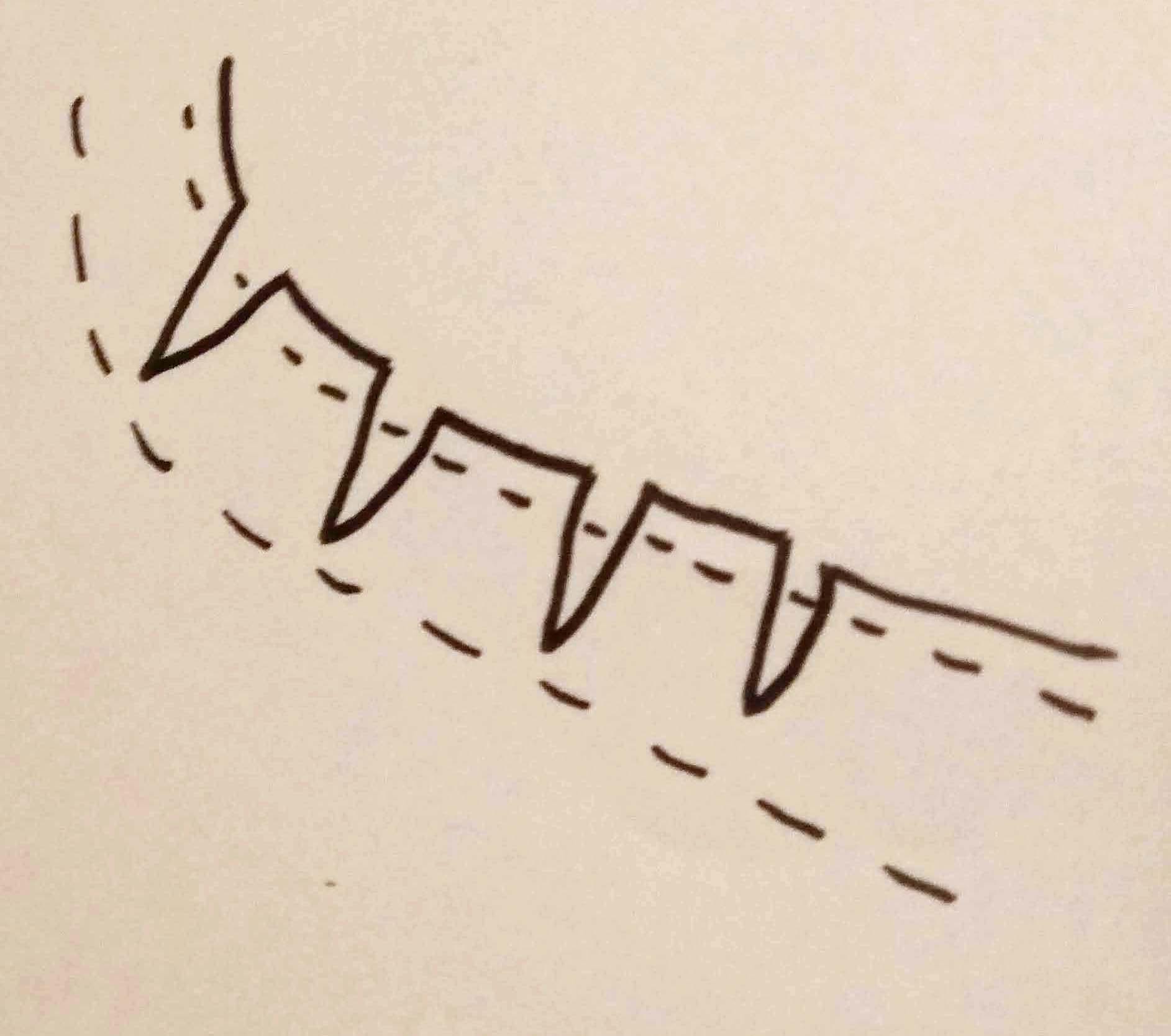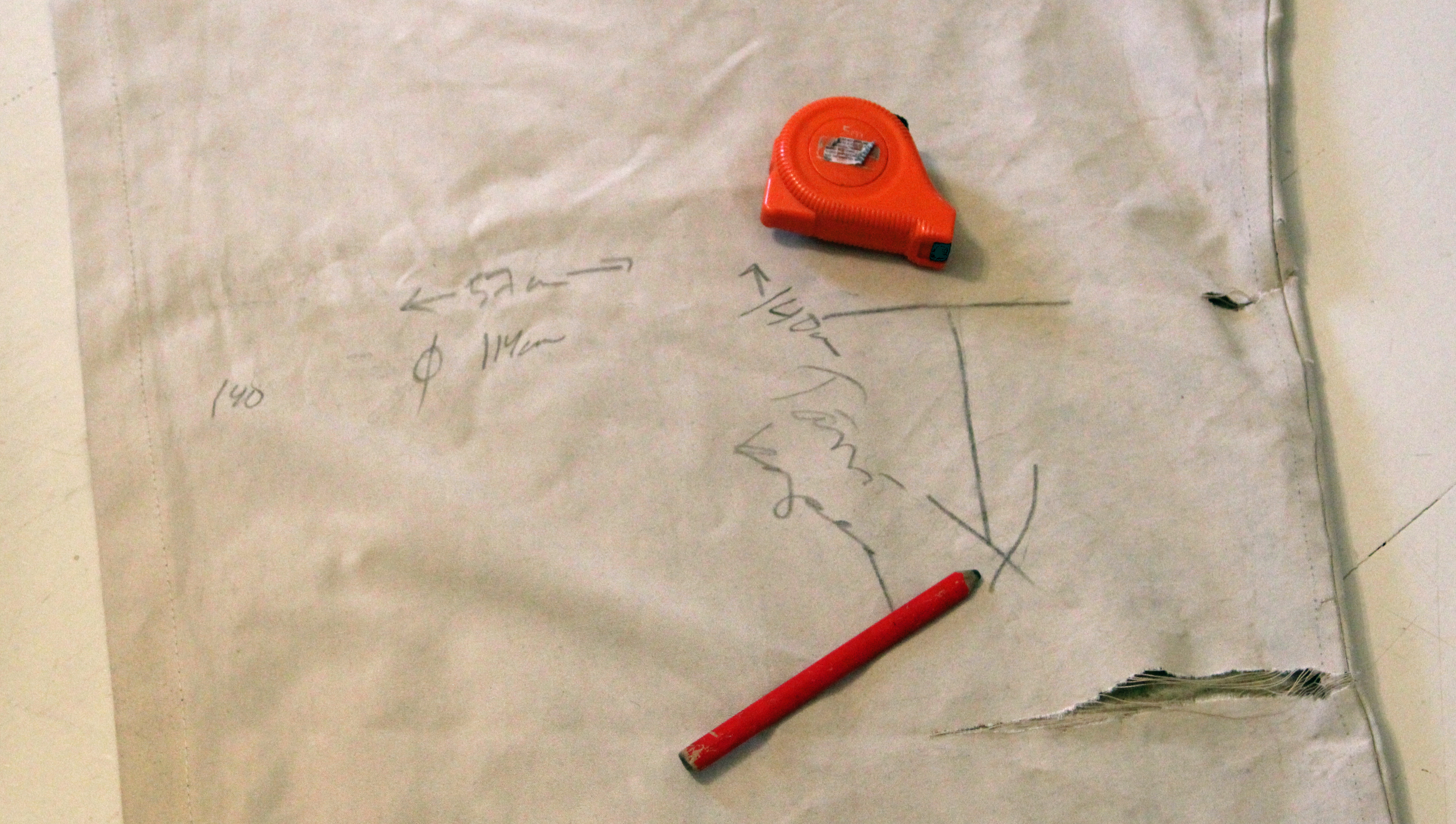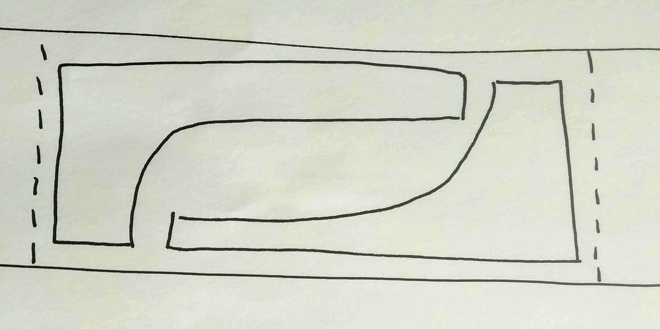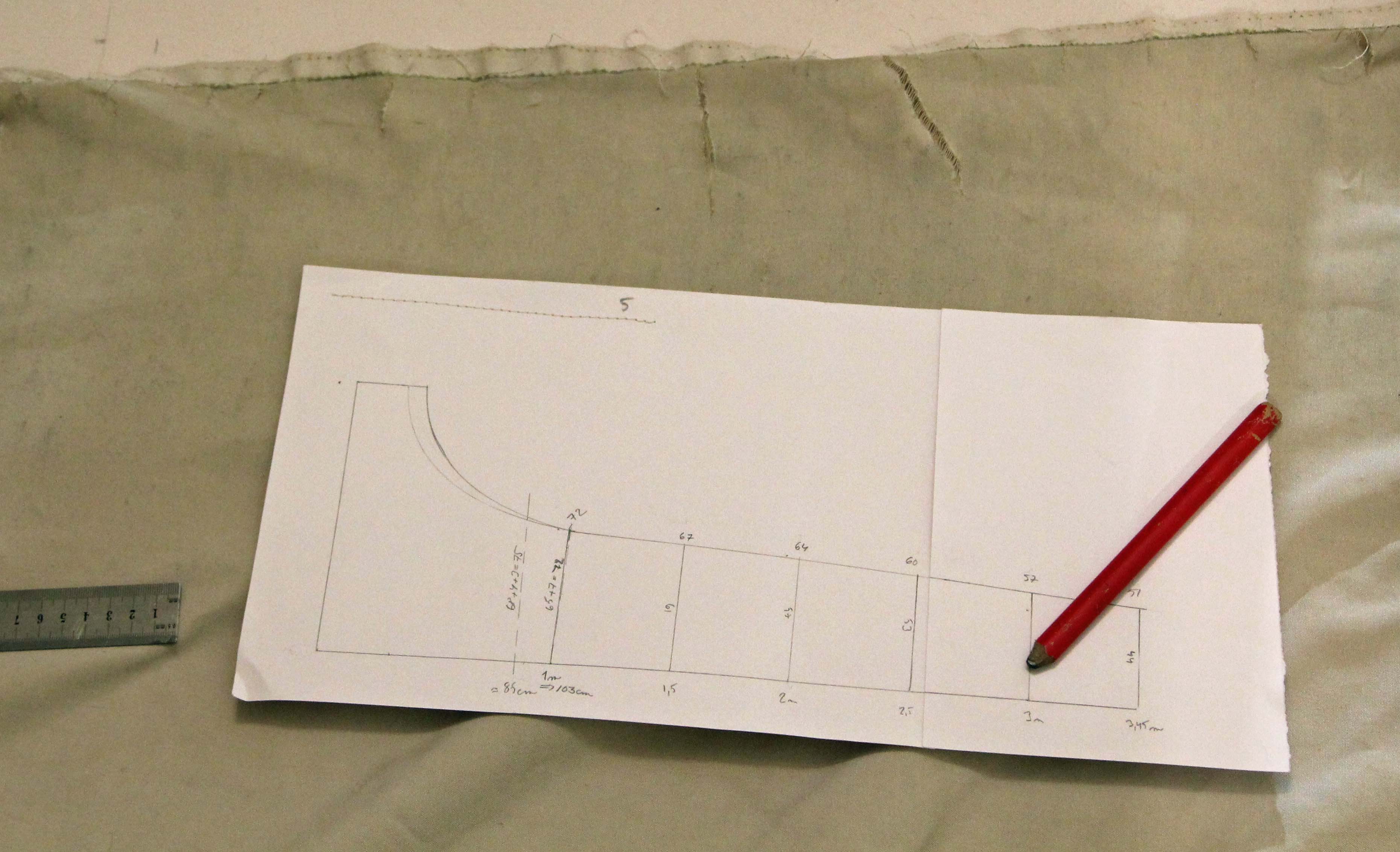 Alkuperäinen suunnitelma oli leikata kaksi palaa kankaasta suurinpiirtein yllä olevan hahmotelman mukaan. Kangas ei ollut kuitenkaan pinnoiltaan symmetristä, kuten tavallinen lakanakangas, vaan toisen puolen pinta oli erilainen. Kahden eripintaisen kappaleen yhdistäminen näyttäisikin jo oudolta.