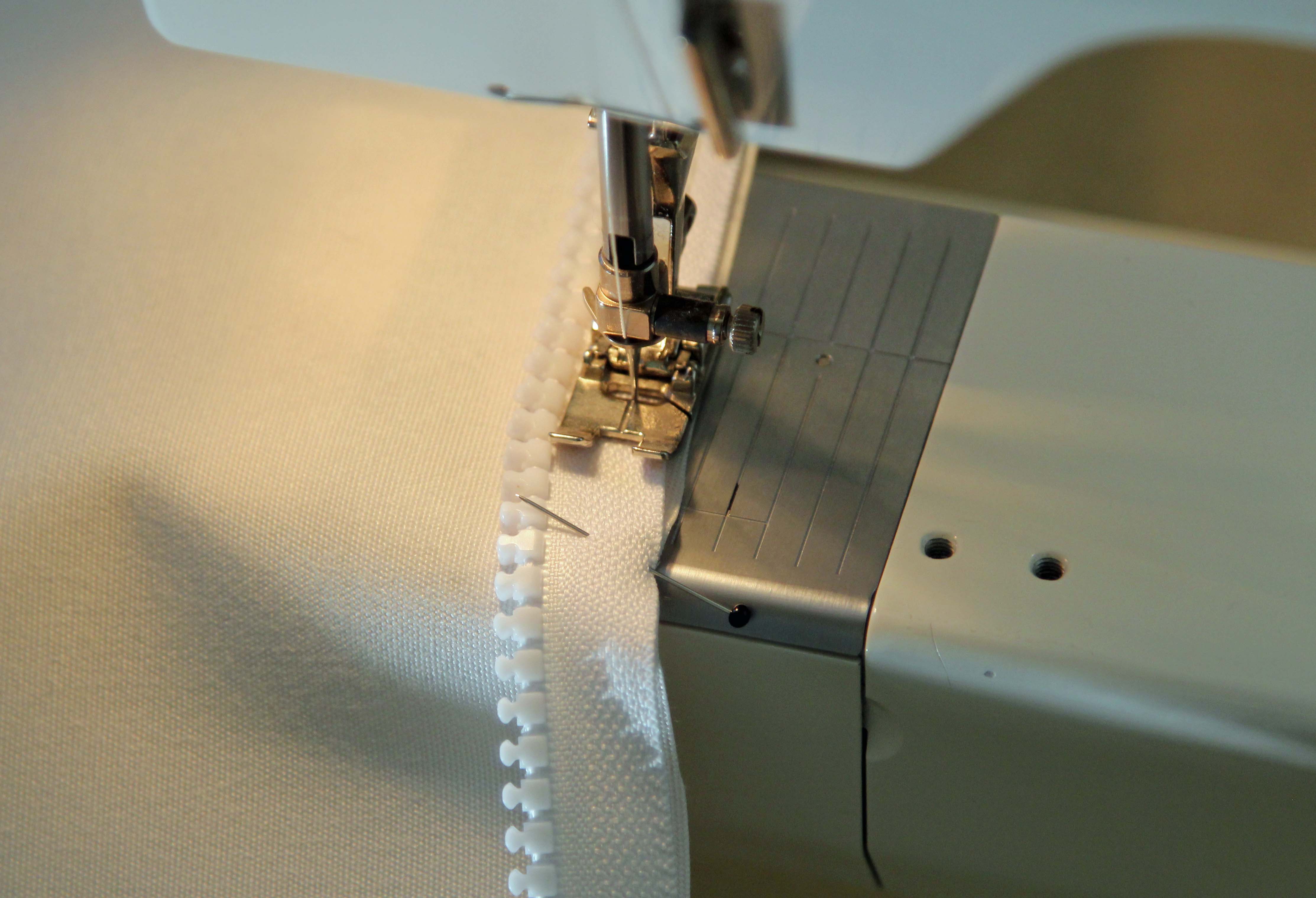 Kuten ompelussa yleensä, kannattaa aluksi työskennellä mahdollisimman pienten kappaleiden kanssa ennen niiden liittämistä toisiinsa. Niinpä päätin ensimmäiseksi ommella vetoketjun mastoa vasten tuleviin paloihin. Ompelin ensin vetoketjun nurinpäin kankaan oikealle puolelle, minkä jälkeen käänsin vetoketjun nurjalle puolelle ja ompelin toisen sauman.