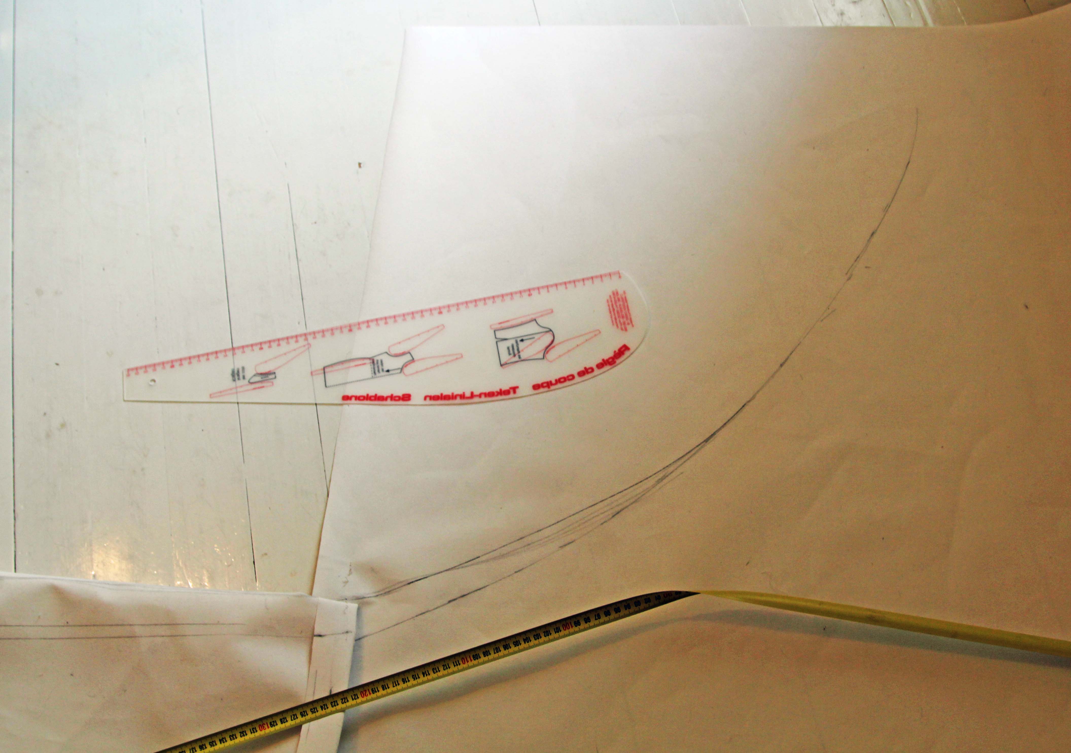 Ennen leikkausta piti tietenkin tehdä uudet kaavat. Kävin veneellä pukemassa vanhan peitteen puomin päälle ja mittasin kohdat, missä se oli liian pieni. Muistiinpanovälineeksi sopi parhaiten vanha peite itse. Kuvassa näkyy myös kankaan repeämä. Tein uudesta puomipeitteestä piirustuksen, mihin merkitsin peitteen korkeuden muutoksen mastosta puomin päätä kohden.