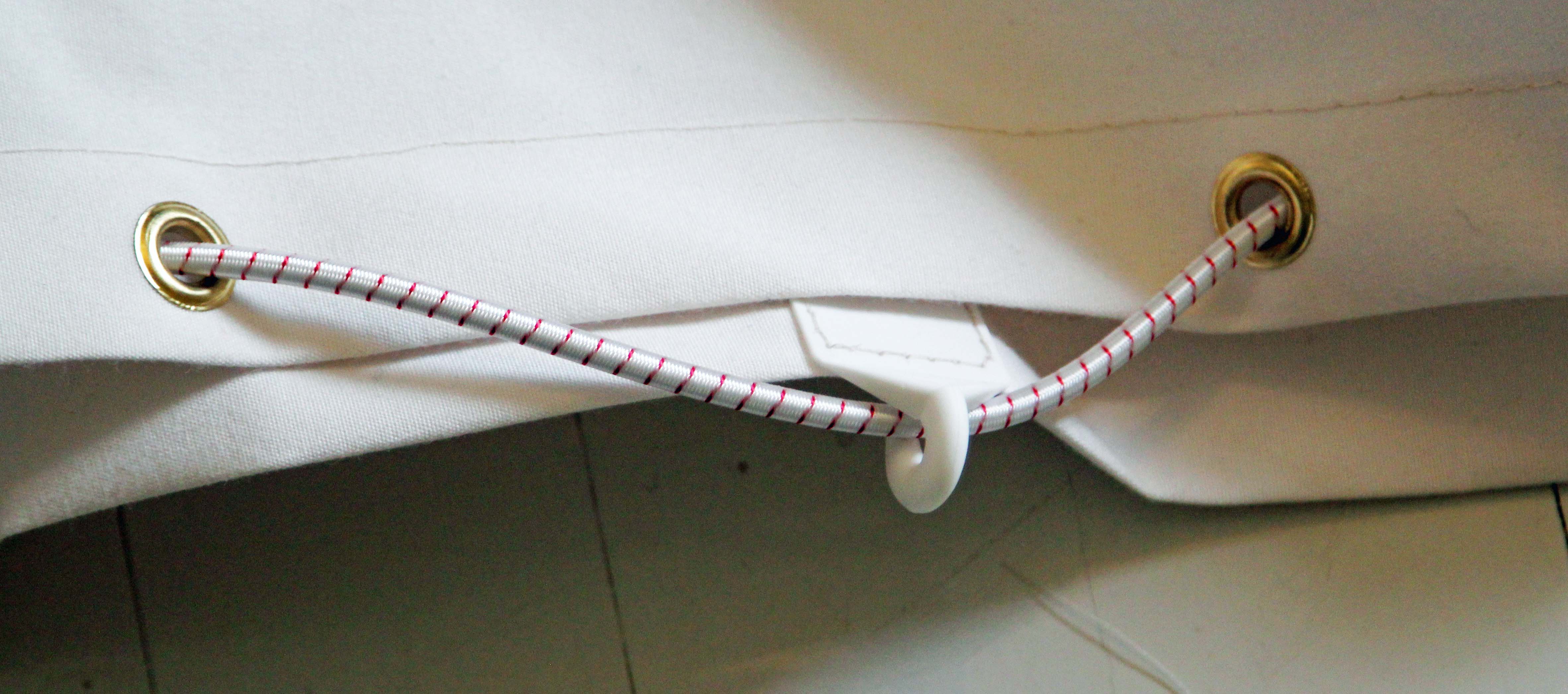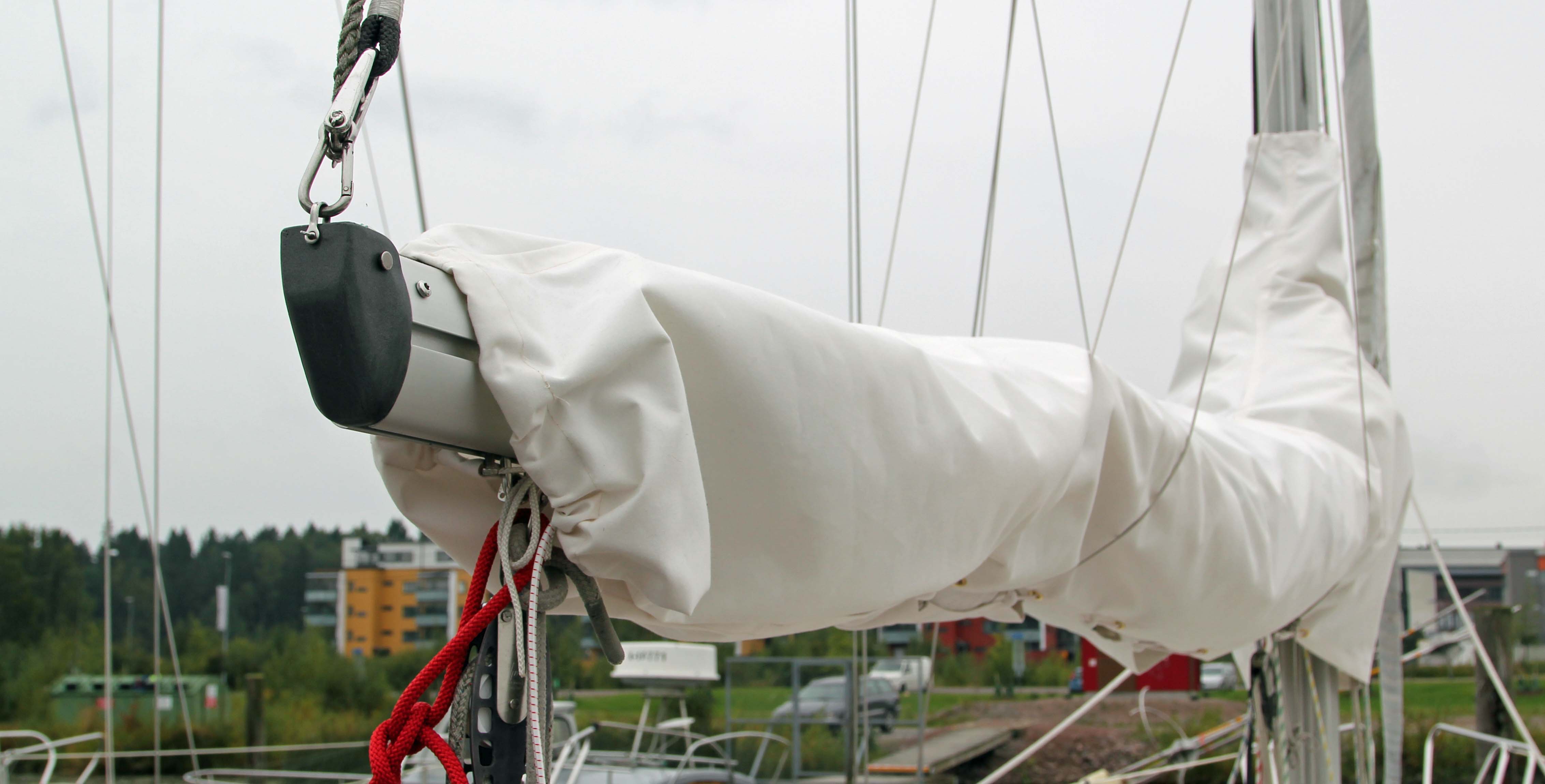 Vanhan puomipeitteen helmassa oli ilmeisen lujasti kiinni pysyvät nepparit, mutta toisaalta olin ihastunut Paulan veneen puomipeitteen kuminauhakiinnitykseen, mikä olisi kannella heiluessa huomattavasti vaivattomampi, etenkin kylmästä kohmeisin sormin. Tarvitsin siis kumiköyttä ja jonkinlaiset, kankaaseen kiinnitettävät koukut. Niitä löytyi ilokseni Hartik Oy:stä.