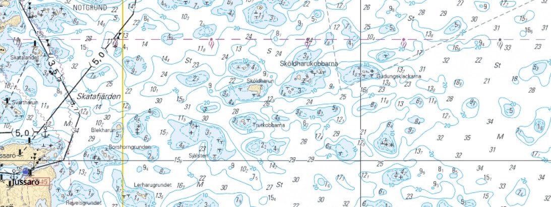 Jussarön koillispuolella pyörimme hetken aikaa ympyrää. Teki mieli jatkaa itään väylien ulkopuolella ja siten oikaista matkaa, mutta karttaplotteri oli harmaana ja miehistö kokematon, joten päätimme lopulta noudattaa kiltisti merkittyä, koilliseen osoittavaa väylää.