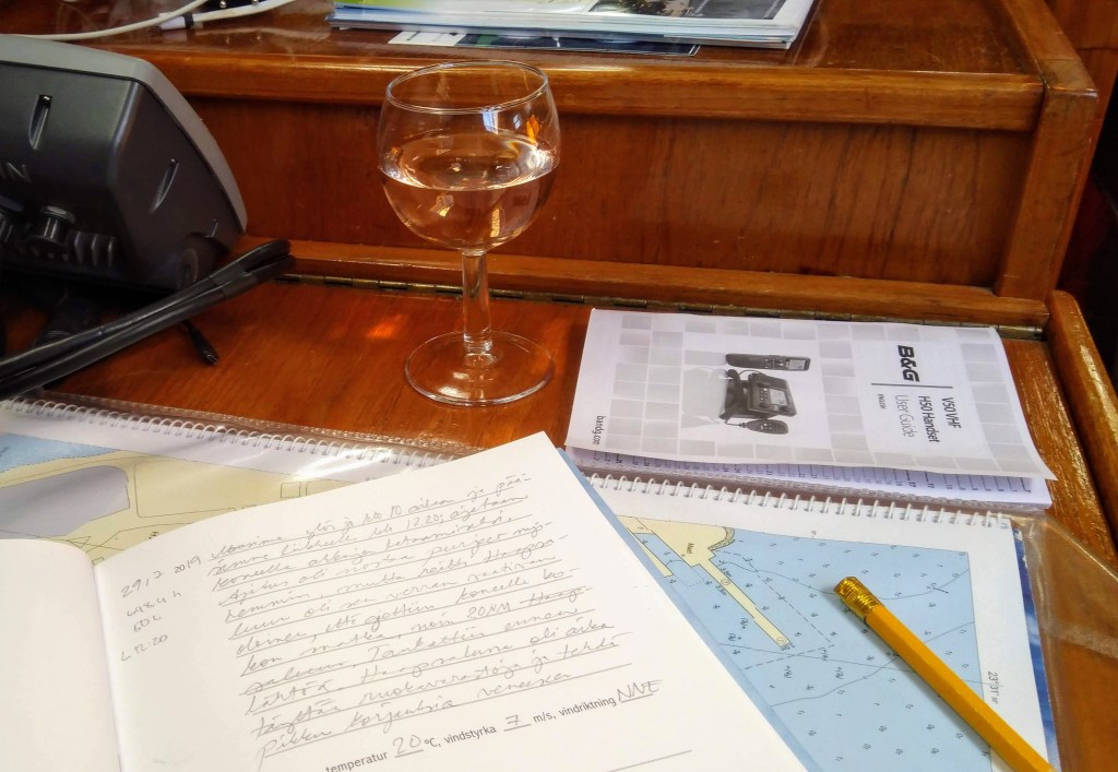 I had also a good time to write the log book while the others were away. Believe or not, the same log book and pencil is next to me right now, although I am 926 NM and 226° from the boat at the moment. Should I get a glass of rosé, too?